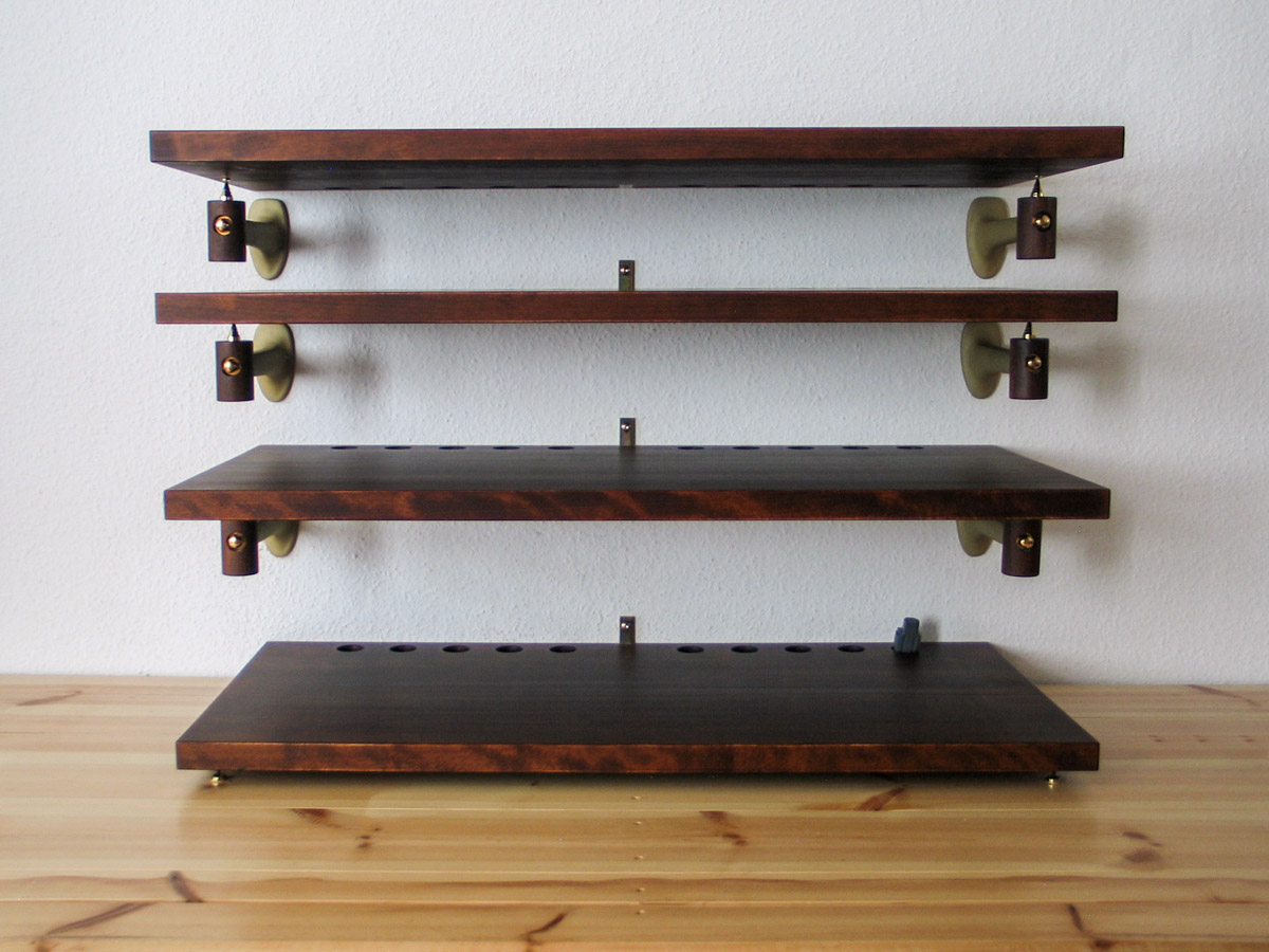 Die Plattform besteht aus Hartkernholz, das mit durchgehenden Lamellen von Hand verleimt ist. Diese ruht auf einer Dreipunktlagerung aus massiven Spikes, die in ein Hartholzwiderlager eingelassen sind. Die Wandhalter der Audio-Plattform bestehen aus einer Aluminiumlegierung, die nach Kundenwunsch eloxiert oder lackiert werden kann.